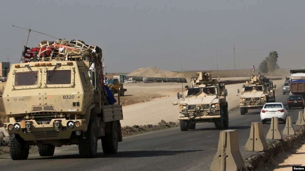 Tomas de video de la agencia Reuters mostraron vehículos blindados con tropas estadounidenses cuando atravesaban el cruce fronterizo de Sahela hacia el norte de Irak.