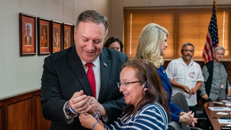 El secretario de Estado, Mike Pompeo, recibe un brazalete azul y blanco, de la periodista nicaraguense exiliada en Costa Rica, Lucía Pineda. Pompeo se reunió con opositores y exiliados nicaraguenses durante su visita a Costa Rica el 20 de enero de 2020. Foto Cortesía State Dept