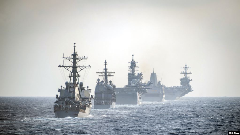 Grupo de barcos de la Marina de EE.UU. navegan por el Mar de la China Meridional el 15 de marzo de 2020.