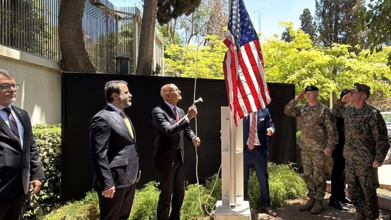 El enviado especial de Estados Unidos en Siria, Tom Barrack, quien también es embajador estadounidense en Turquía, izó la bandera en presencia del ministro de Asuntos Exteriores sirio, Asaad Shibani, según mostró un vídeo de Reuters.